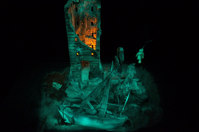 You'll note in this next image the presence of the underwater diver to the upper right. He is actually there but I used him from an earlier version, migrating him into this version instead. He was created by suspending the figure from a heavy piece of bendable wire until I got him in the direction I wanted and then allowing him to just float there. He also has a phosphorescent paint on him