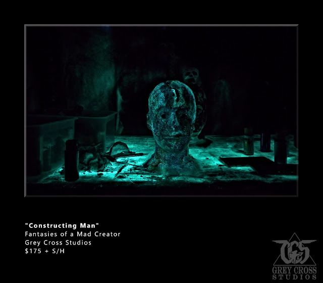 One night as I was nearing the end of my evening in the studio, I found a remarkable sight. I'd left two of the head sculptures I'd been creating on my work table to be completed later. One of the heads had an under-layer of phosphorescent paint on it which had been painted over. Some of it was still peaking out through the paint but with the lights on, I hadn't noticed it.